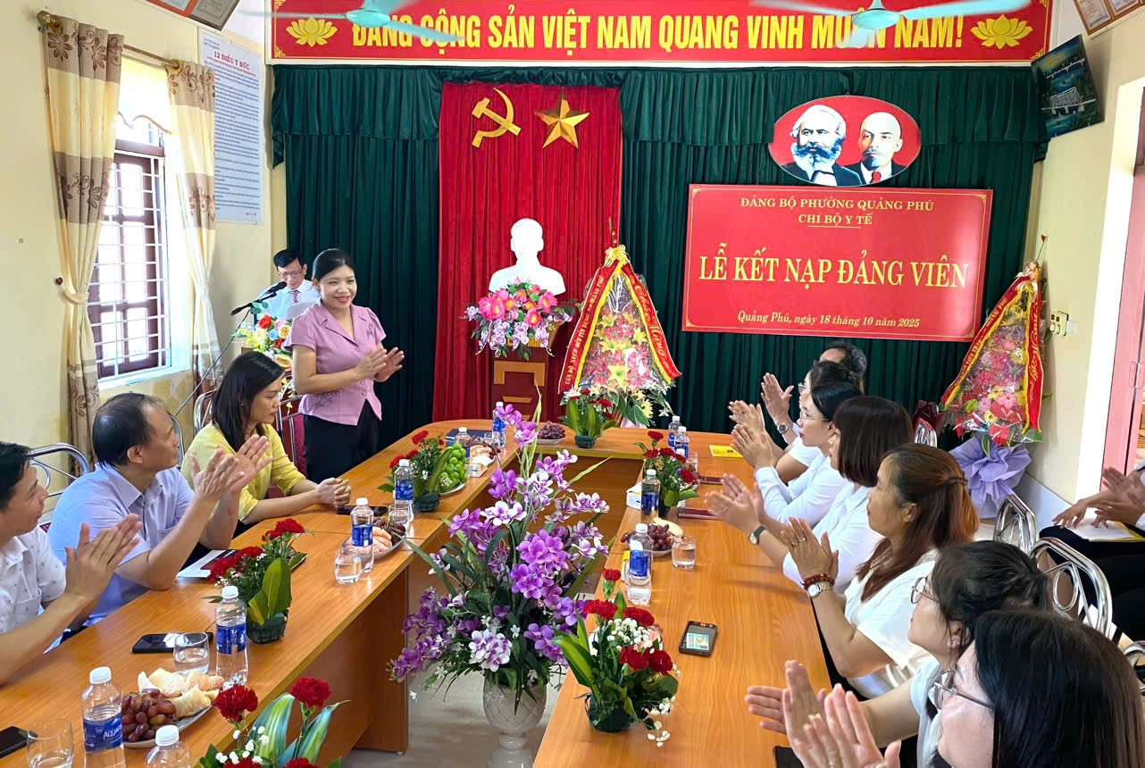 Chiều ngày 18/10, Chi bộ Trạm Y tế phường Quảng Phú long trọng tổ chức Lễ kết nạp đảng viên mới cho 2 quần chúng ưu tú. Dự buổi Lễ có đồng chí Nguyễn Thị Thu Hà, Phó Bí thư Thường trực Đảng ủy phường; Lê Thị Trúc Quỳnh, Ủy viên Ban Thường vụ, Trưởng Ban xây dựng Đảng; cùng các đồng chí trong Ban Chấp hành Đảng bộ, chuyên viên Ban xây dựng Đảng, lãnh đạo Trạm Y tế và toàn thể đảng viên trong chi bộ.